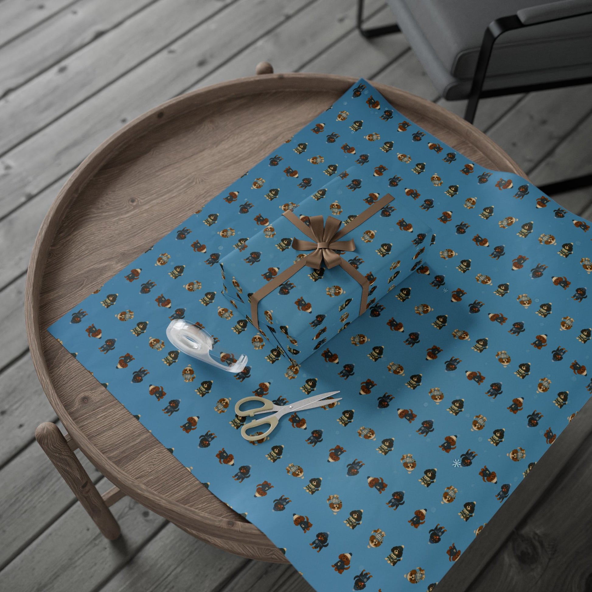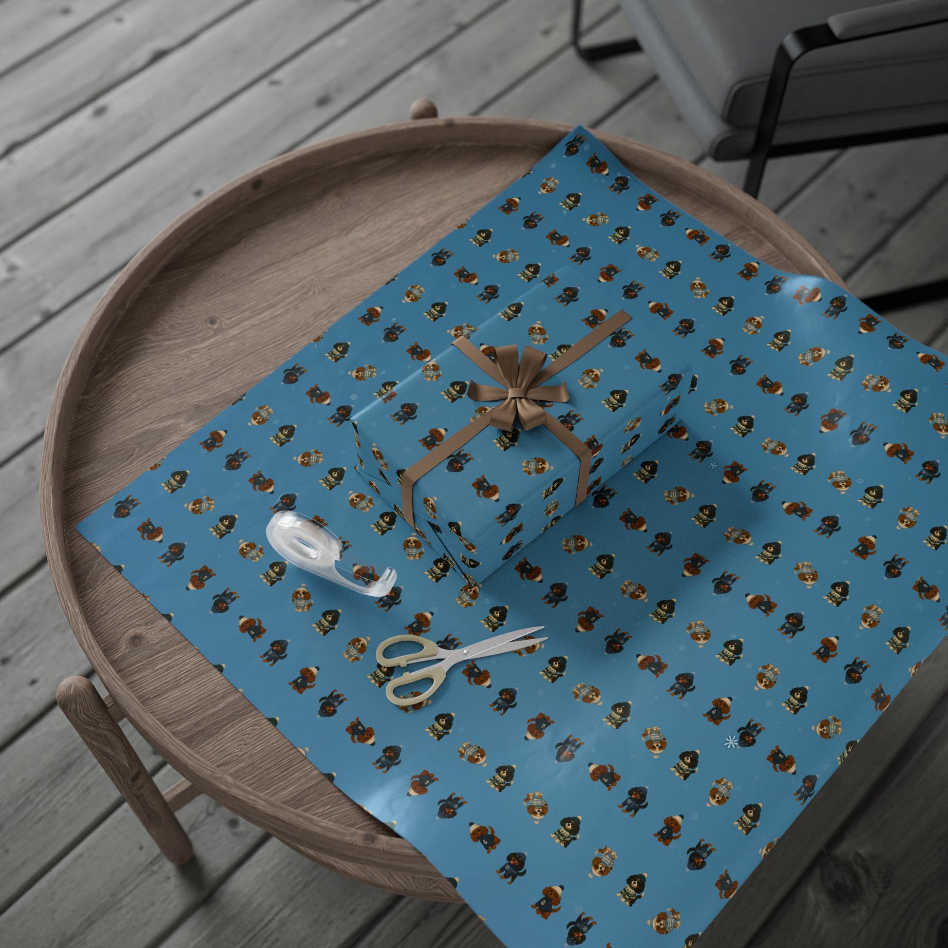 Soft, joyful wrapping paper printed on sturdy 90gsm fine art stock. Tiny, hand-drawn cavalier king charles spaniels march across a dusty blue field, each one sporting a cozy sweater or little accessory, a warm, playful pattern that makes any package feel personal. The print is one-sided with a polished glossy or smooth matte finish, and comes in long, generous rolls so you can wrap gifts for birthdays, winter gatherings, or cozy house visits without seams showing. Subtle white printing edges with a small barcode and QR strip appear at the top and bottom of each roll.