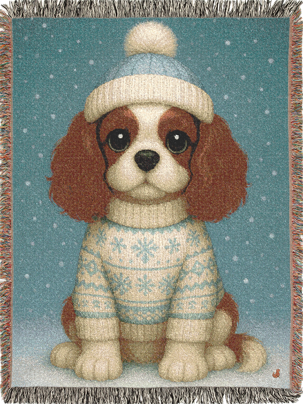 Wrap yourself in cozy charm with Cavy Comfort, a woven blanket that brings warmth, whimsy, and a dash of a Blenheim Cavalier's sweetness to your home. Featuring an adorable pup bundled in a winter sweater and beanie, this blanket captures the pure comfort of companionship; perfect for snuggling up on cold nights or adding a touch of joy to your decor.
