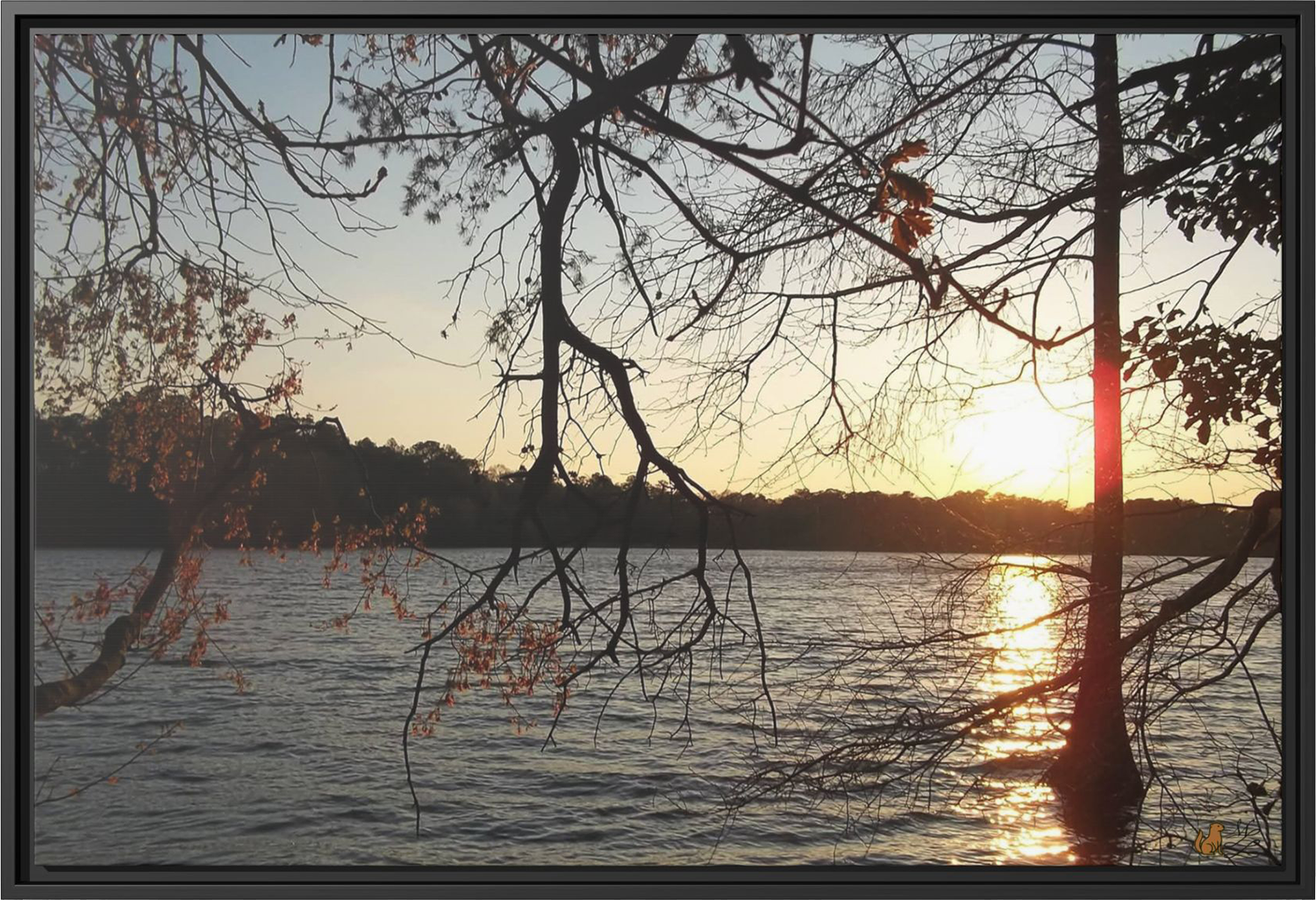 Bask in the quiet glow of twilight with Evening Stillness, a framed matte canvas print captured at Trap Pond State Park in Delaware. Sunlight filters through the trees and dances across the still water, evoking reflection and calm, a perfect moment between light and shadow.